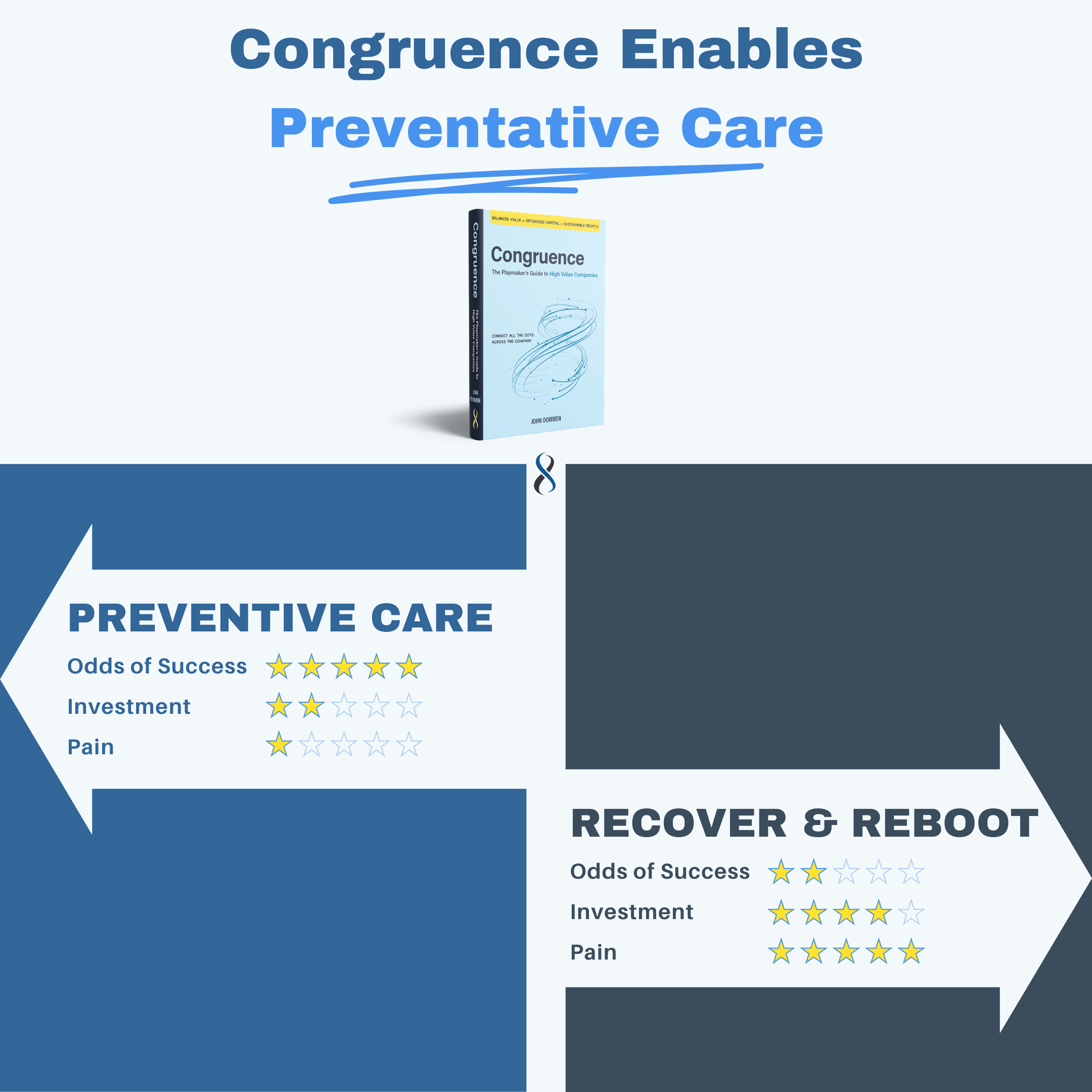 Few companies proactively choose preventive care to maximize odds of optimal outcomes. Proactive evolution is a necessity to succeed through scale, time, and environmental shifts. It enables efficient use of capital to maximize value with the highest probability and least risk.