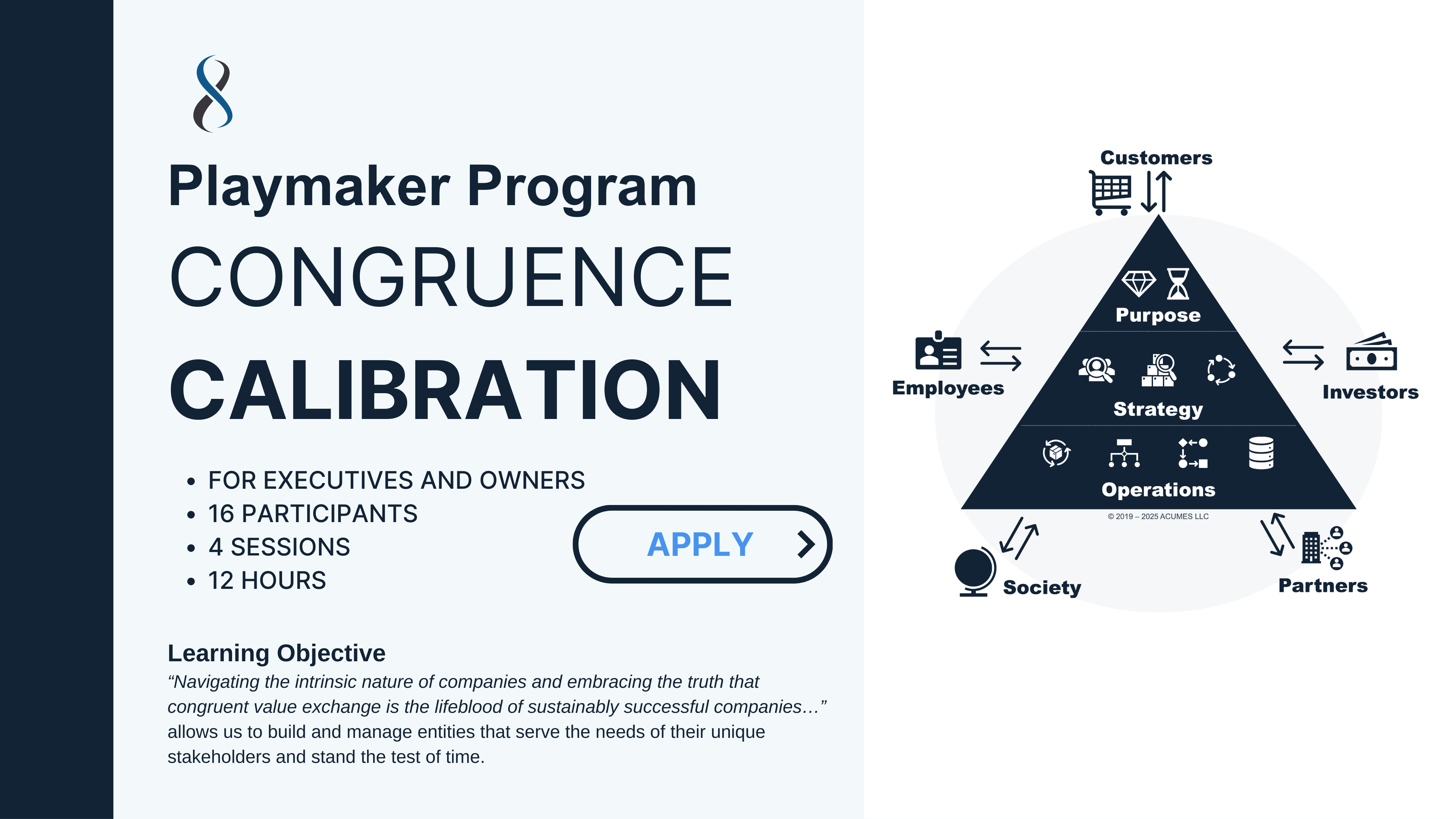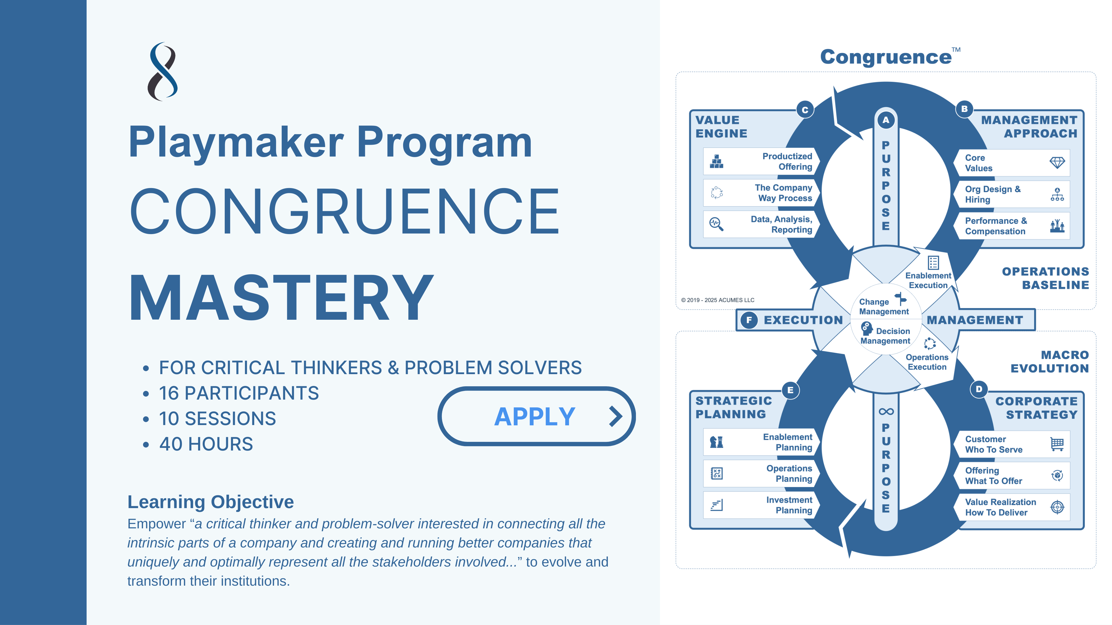 Congruence and The Playmaker Program prepare you to lead the economic transition to meritocratic, value-centric, capital-efficient, and sustainably profitable companies.